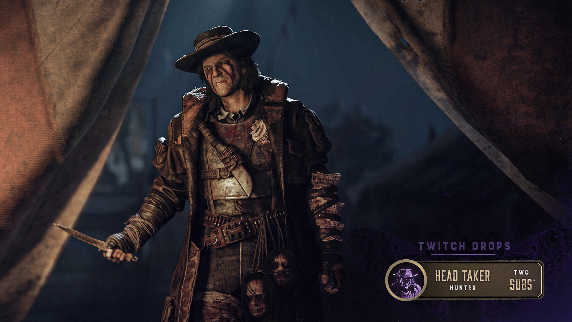 This Drops campaign introduces two brand‑new Support a Streamer rewards. You'll be able to earn a Hunt-themed Twitch Chat Badge by subscribing or gifting one subscription to a channel streaming Hunt: Showdown 1896 live. Additionally, you can also earn a new Legendary Hunter, Head Taker, by subscribing or gifting a cumulative of two subscriptions to a channel live streaming Hunt!