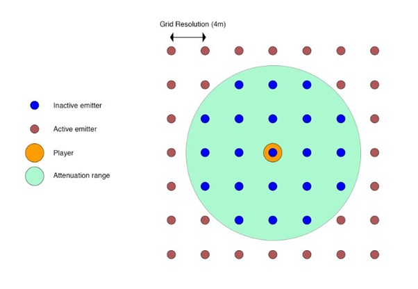 The following chart shows the audio grid visualizing multiple layers around the player that come into play when simulating a rain in Hunt: Showdown 1896: