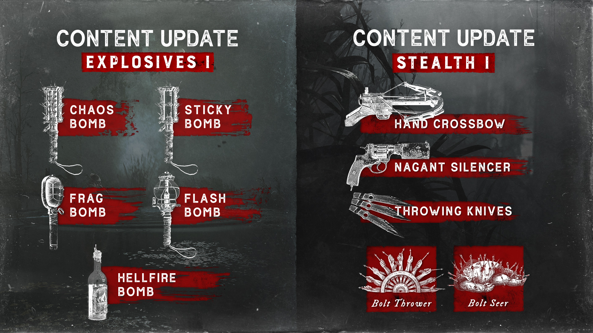 Since Hunt launched on Xbox Game Preview, we've added three updates. Each Update is grouped into a themed pack of a mix of weapons, tools, and/or traits. We started out by adding a Close Combat pack, which gave players the tools to be more deadly at close range. That was followed by a double release of a Stealth Update pack and an Explosive Update Pack. Something for the strong and silent types, as well as those who like to make their entrance (or exit) with a bang.