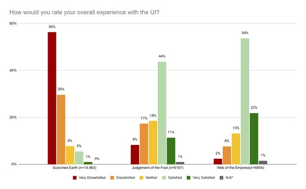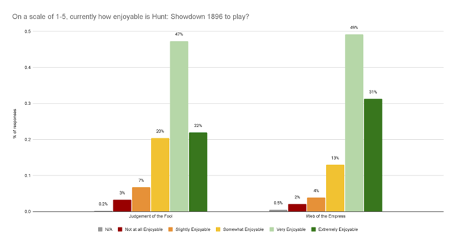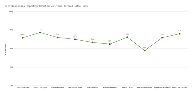 We started this with Judgement of the Fool as a temperature check, and we will continue to do so for all upcoming Event surveys. As you can see, 80% of players felt the game right now was an enjoyable experience. A sharp increase from 69% after the last Event.