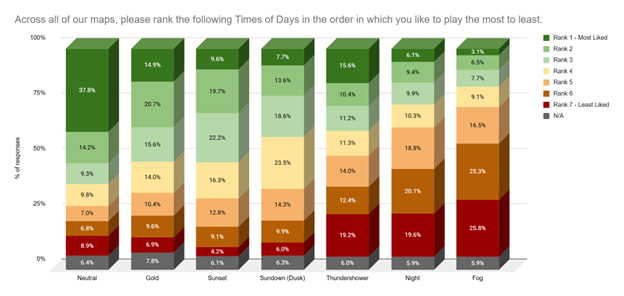 When we asked about ranking our Times of Day, we wanted to confirm what we already suspected from the hard data. As expected, there is a stronger preference for conditions that provide more balanced competitive environments. And our more atmospheric conditions that impact audio/visuals were rated towards the latter half. This is also in-line with our telemetry data of leavers, as Fog is considered to have the most of them. In the graph below, the leftmost condition was the highest rank, and the rightmost was the lowest.