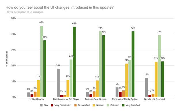 The lobby rework, matchmaking for a 3rd random player, and the addition of Traits in the gear screen saw some of our highest positive receptions. These features have been requested for a long time, and we are glad to see an overall trend towards more satisfying experiences with our UI. We hope that with further improvements planned for next year, we can continue to see more positive reception. However, for our next update, we are focusing on some of the beats mentioned in our roadmap recently.
