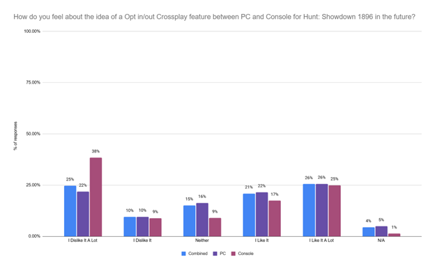 Now for the hotly debated topic of cross-play. We floated the idea of opt-in/out cross-play existing within our game. Like we said in our survey, we wanted to get a temperature check to see where the larger community was with this. While we predicted a polarizing response, we did not expect this to be so evenly matched. For the majority of the survey deployment, there were an equivalent number of responses that strongly liked and disliked this idea.