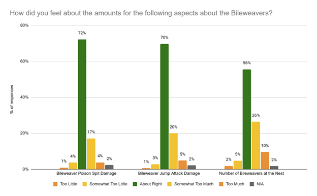 While their damage numbers were perceived as balanced by almost two-thirds of the responses, their number of spawns and inconsistent hitboxes were more emergent problems. Both items are being investigated for the future, if they return. You never know—Bileweaver infestations are hard to stamp out. They are persistent and can come back with a vengeance, and you can only hope you have the proper equipment for it...fiery things, preferably.
