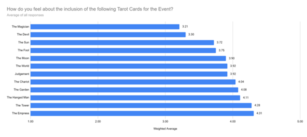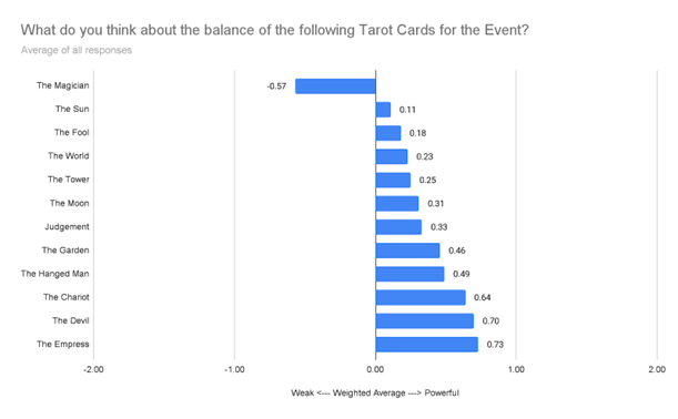 Compared to those two, The Empress and The World were by and far the most used Tarot Cards of the Event. Another point we are investigating is the Judgement card. While it is in the middle of the pack for rating and perceived balance, it is the 2nd least used Tarot Card by far.