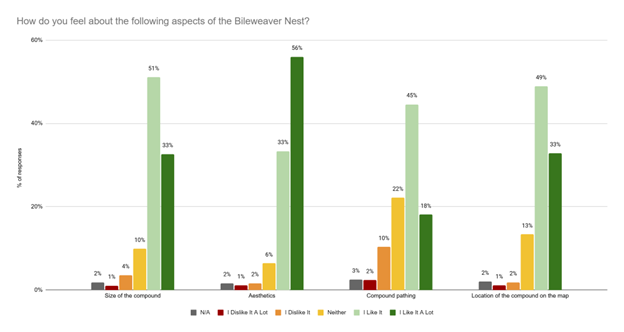 "Aesthetics" was a big positive, with a lot of positive feedback about how fresh and horror-centric the compound felt. We also heard some minor complaints about an increase in visual noise due to the nature of the material. This complaint—paired with the randomized layout—did make it harder to find items within the Bileweaver Nest. However, we felt this played more accordingly to design intention.