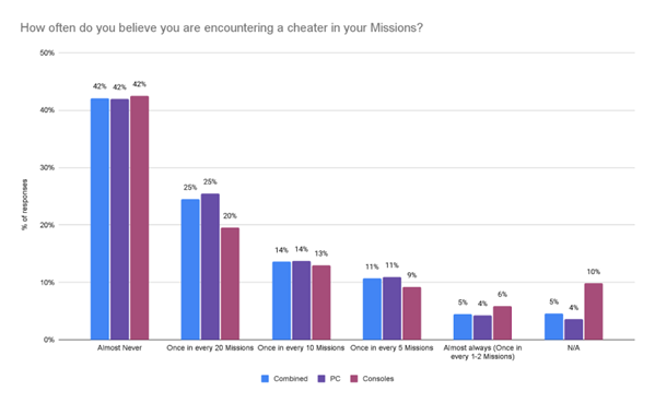 Now let's focus on the Anti-Cheat perceptions. 30% of you feel that you encounter a cheater once in every 10 or less Missions. Like our roadmap said, we banned 14,000 cheaters this year already. However, we did not want to bias your views prior to this survey, and it is clear that both items are much higher than we want them to be. Taking a look at the data, PC and console players have similar perceptions of the problem. We missed an opportunity to ask about your MMR and the game modes you play. Mainly to see if there was a difference in perception based on your skill level and which games modes you play. Regardless, Anti-Cheat measures are our top priority for 2026, as we want to ensure a fair playing field for all.